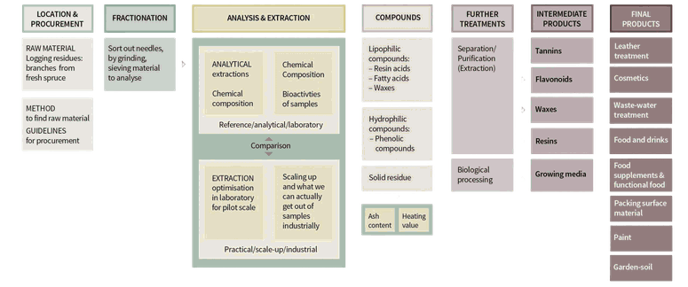 När projektet startade i maj 2021 visste vi att avverkningsrester innehöll värdefulla gröna kemikalier men saknade metoder för att separera ut barr eller extrahera kemikalier. I oktober 2022 hade vi utvecklat en modell för att lokalisera och kvantifiera tillgången till barr i Botnia Atlantica-regionen, skissat på alternativa värdekedjor och hittat ett sätt att separera barr och utvecklat tekniken för att extrahera en mängd kemikalier. Två företag validerade den industriella potentialen för skinnprodukter och kosmetika. Ett oväntat fynd var att den återstående fasta restprodukten kan användas för odling.